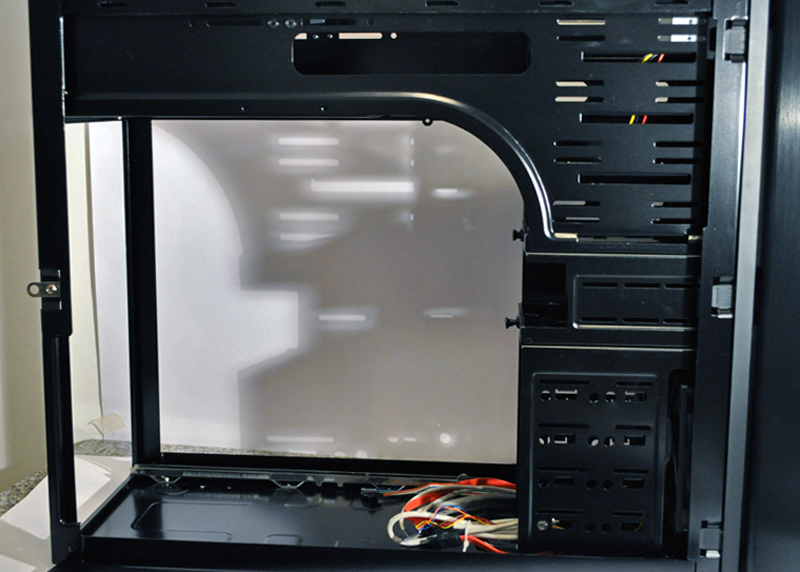 Possiamo notare che il case è diviso principalmente n due settori: il primo in alto che ospita l’alimentatore e i suoi rispettivi cavi e la sezione sottostante, sul vassoio, dove monteremo la nostra scheda madre.
